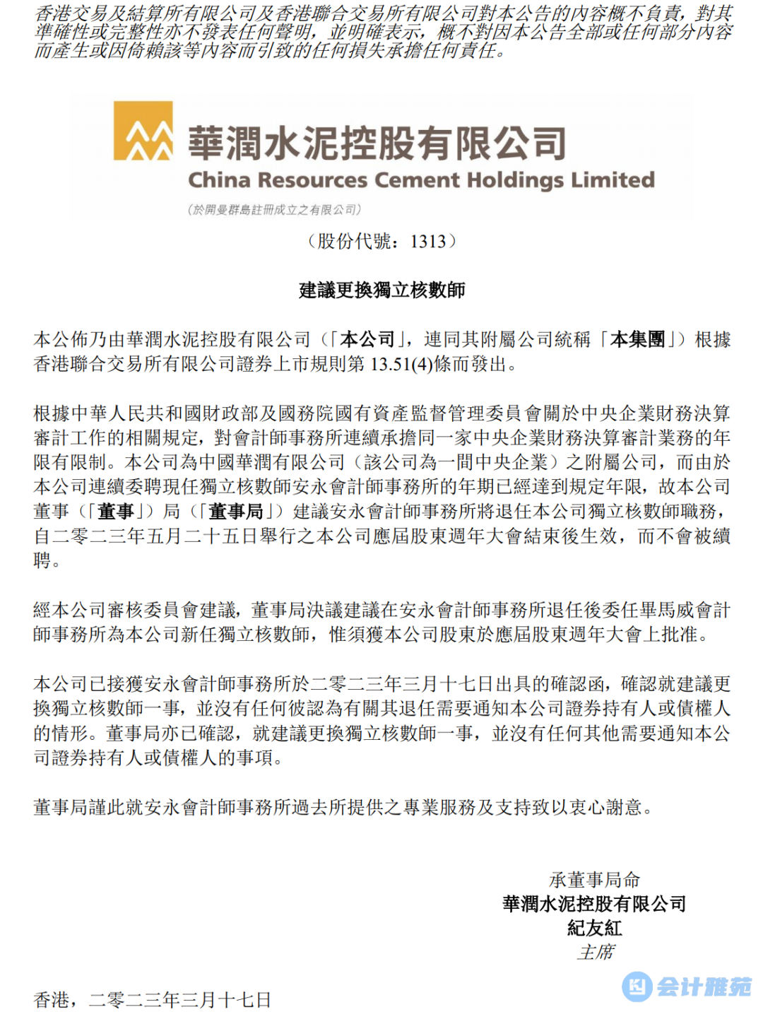 涉及央企审计轮换,华润水泥变更会计师事务所!