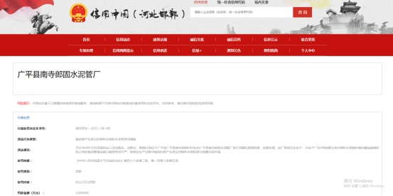 近日,信用中国(河北邯郸)平台发布了广平县南寺郎固水泥管厂输送易产生扬尘的物料水泥粉未采取密闭措施的处罚通知。