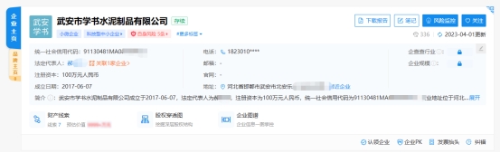 据公开信息显示,武安市学书水泥制品有限公司负责人:郝某某,地址:河北省邯郸市武安市,经营范围:水泥制品生产销售。(不得从事本市产业政策禁止和限制类项目的经营活动)(依法须经批准的项目,经相关部门批准后方可开展经营活动)***