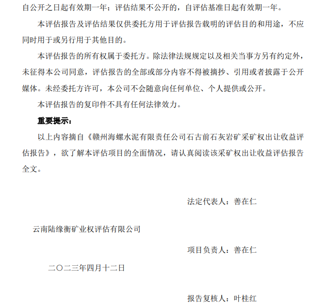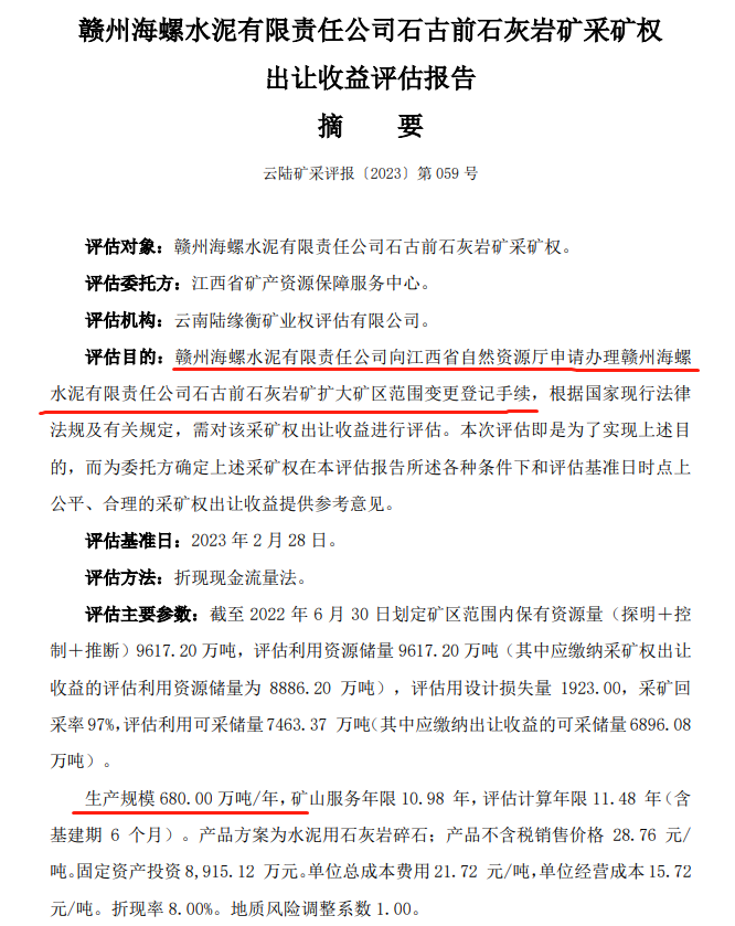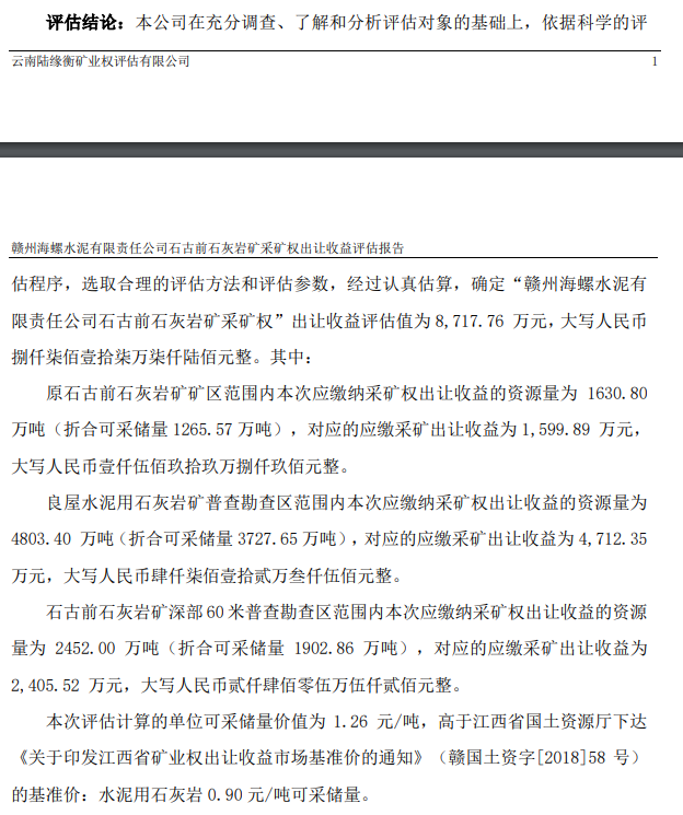 近日,江西省自然资源厅发布赣州海螺水泥有限责任公司石古前石灰岩矿采矿权出让收益评估报告公示。