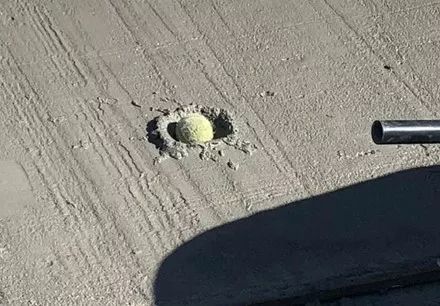 金毛球掉到没干的水泥里,它静静看着主人:那个,麻烦帮我捡起来一下!