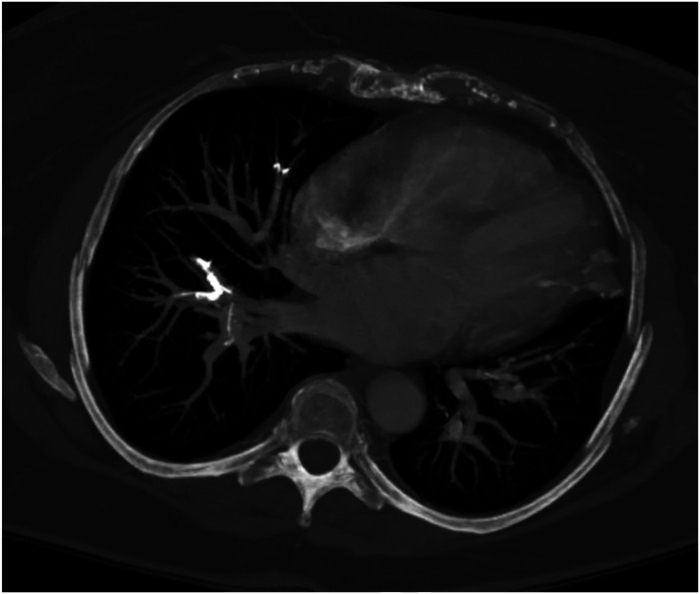 注:计算机断层扫描显示各种肺动脉中的物质密度高于造影剂,以白色表示;血栓形成材料的密度通常低于造影剂的密度,以黑色表示。
