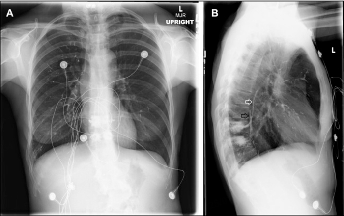 在急诊科,患者接受了全面的体格检查,结果未见异常。心电图检查和基础实验室检查结果也未见显著异常。为了进一步评估,进行了胸部X线检查。
