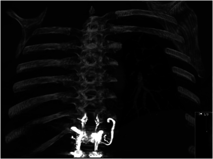 第一位患者,在术后出现相关呼吸系统症状,由于观察到高密度以及表明肺动脉高压的右/左心室比值增加,可能是由在Th11-L3进行的椎体成形术引起的,因此怀疑骨水泥肺栓塞。