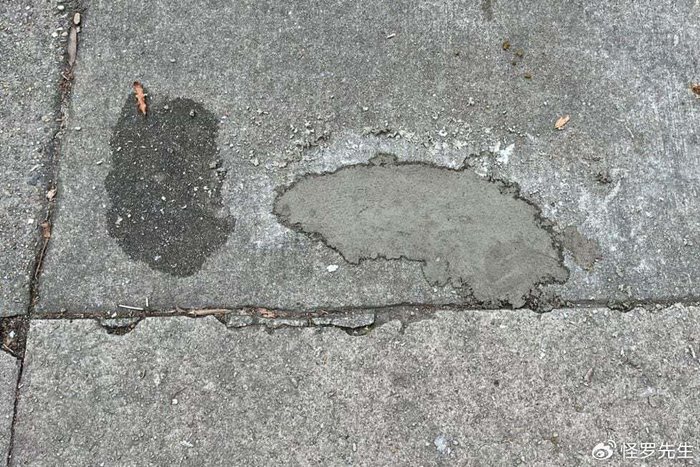 虽然没有亲眼所见,但也能想象出,这个地面上形似老鼠的水泥坑,是某种动物在路面还未干的情况下留下的。