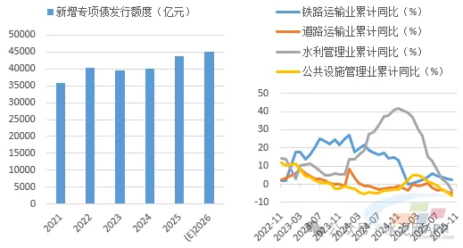 基建方面,我们判断2026年投资将回正,基建端水泥需求将有改善。“十五五”规划建议指出,加强谋划论证,实施一批重大标志性工程项目,高质量推进国家重大战略实施和重点领域安全能力项目建设。2026年作为“十五五”开局之年,预计专项债、超长期特别国债发行规模将出现提高,基建投资将出现回正,但在化债政策影响下,水泥需求关系密切的交通类和市政基建投资或将延续低迷态势,预计基建整体对水泥需求支撑将有所改善,但力度可能仍然不强。